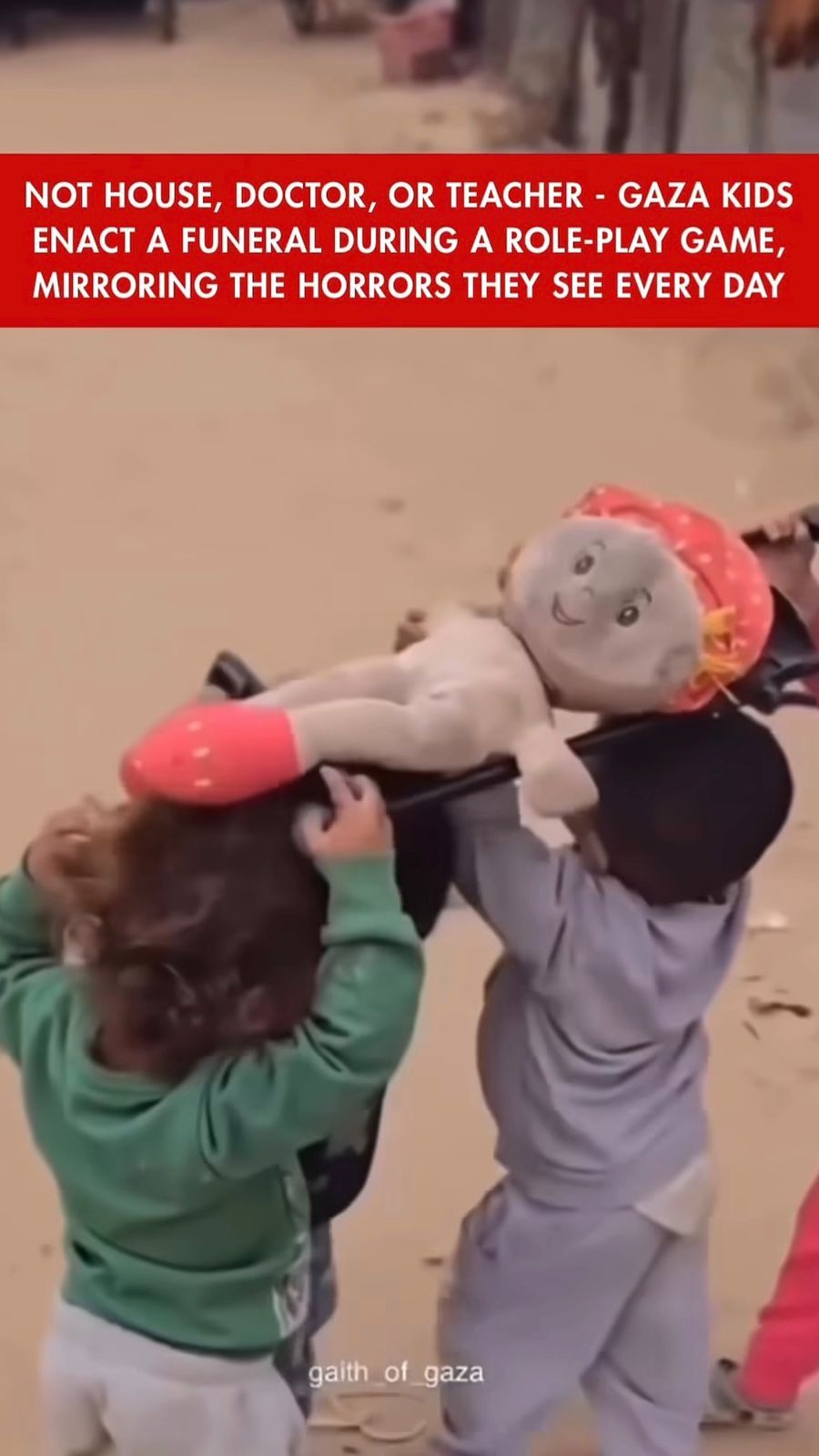 The Fact: In a video now going viral on the internet, five Gaza children are shown carrying a dust-covered doll on a makeshift stretcher, likely mimicking a funeral. The video shows how exposure to death and loss has become part of Gazans’ daily life, and even the simple joys of mock weddings for dolls have been replaced by role plays of mourning.